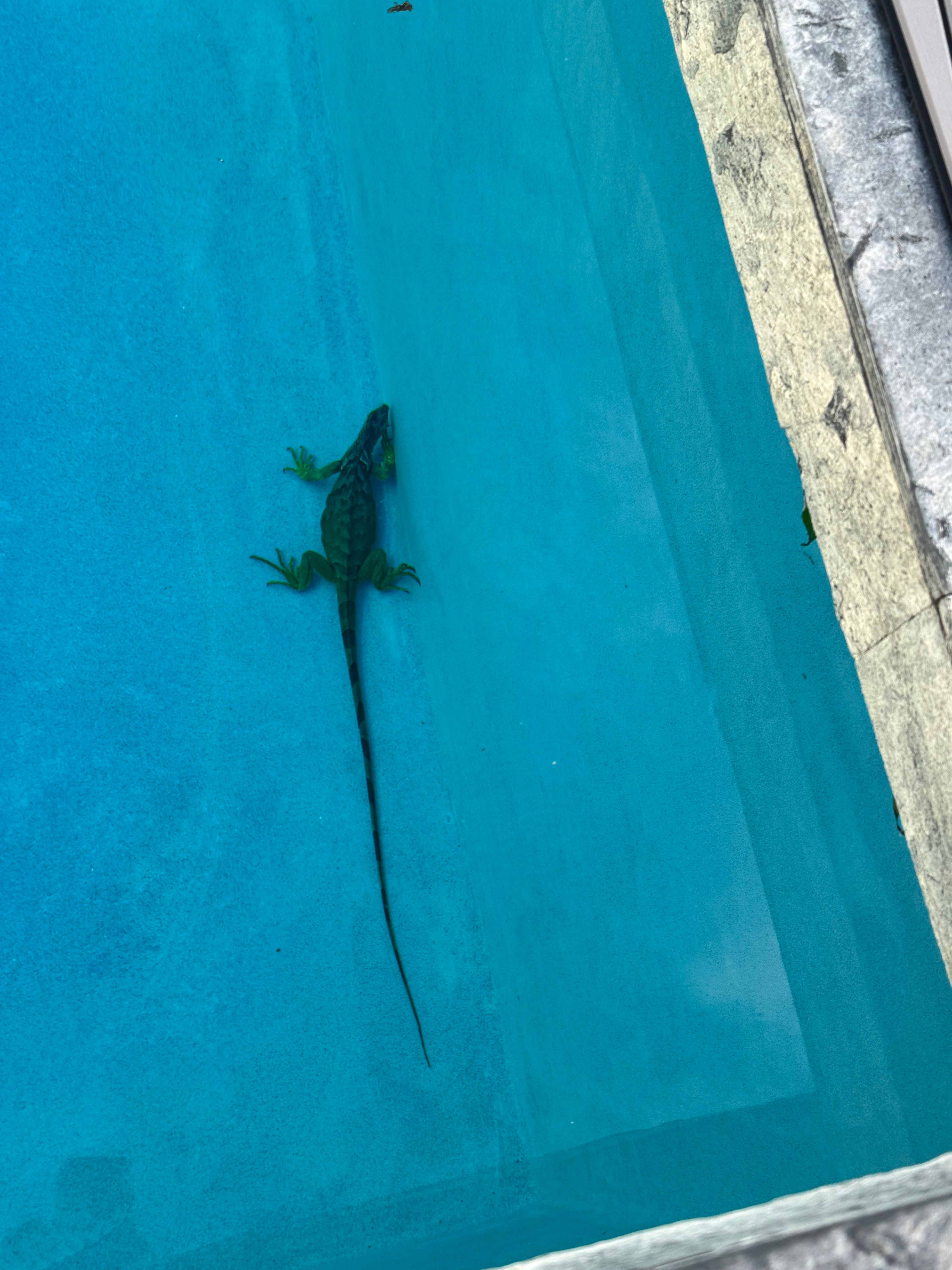 The edge of the pool has a lip. The iguana couldn’t figure this out and thrashed around a bit before deciding to chill at the bottom. At which point, I did what any sane person would and called for help.